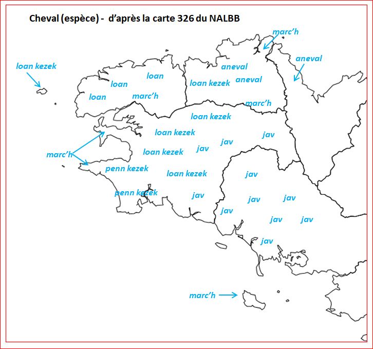 La carte 3, ci-dessous, illustre la diversité dialectale du breton ; elle montre la répartition du mot désignant le cheval sur le territoire bas-breton : aneval, jav, kezeg, loan, loan kezeg, marc’h, penn kezeg. On peut voir sur cette carte que la réalité des dialectes ne correspond pas tout à fait au découpage des anciens évêchés (tel que je l’ai représenté dans la carte 2).