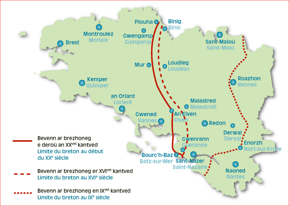 Le breton a connu une expansion géographique maximale au XIV siècle (atteignant Rennes et Nantes), visible dans la toponymie (répartition des toponymes en plou-, par exemple).
