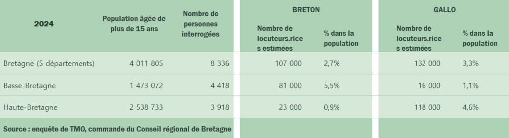 La dernière estimation du nombre de brittophones date de 2024 ; il s’agit d’un sondage commandé par le Conseil régional de Bretagne à l’institut TMO. A cette date, on estimait à 107 000 personnes, le nombre de personnes qui parlaient breton en Bretagne (5 départements).